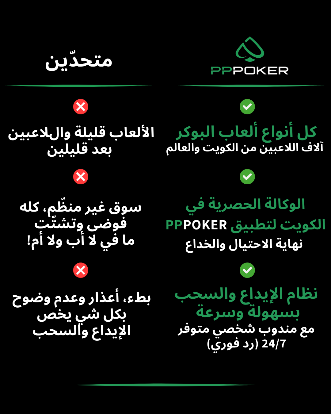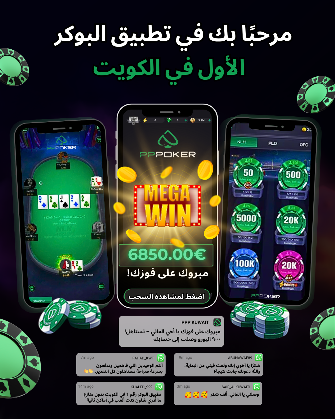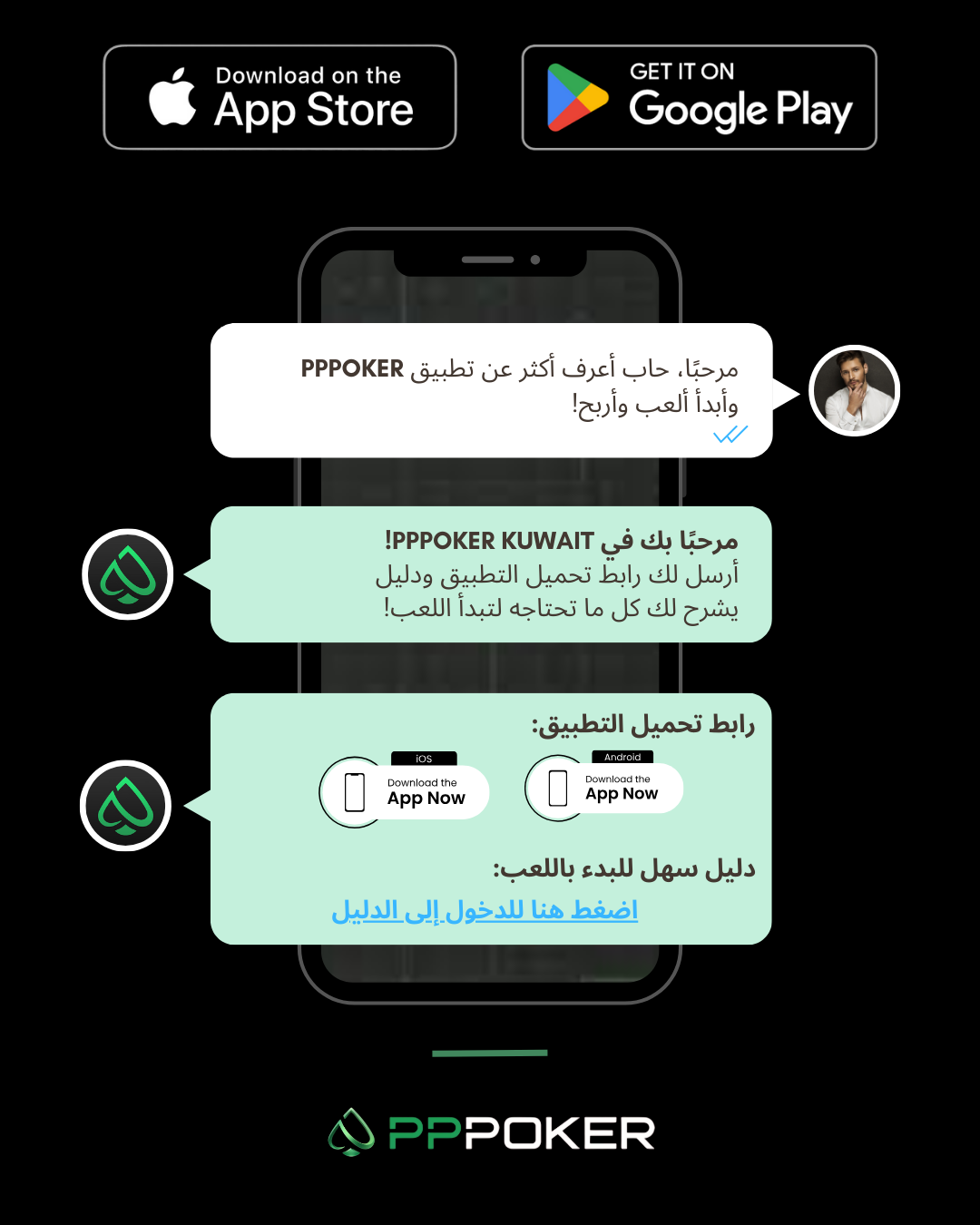 تطبيق PPPoker هو تطبيق بوكر عالمي معروف ومشهور في كل مكان. إحنا وفرناه بالكويت عشان نبني مجتمع محلي قوي وراقي